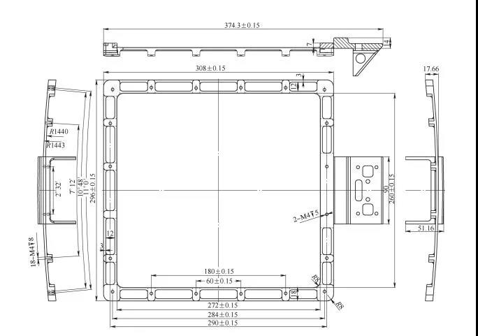 框架零件材料為TC4 鈦合金,其結構及尺寸如圖2所示,長 374 . 3mm 、寬 296mm 、厚51.16mm,是我公司最大的鈦合金零件。其壁厚最薄處為3mm,外形為R1 443mm大圓弧曲面,形狀復雜。鈦合金本身為難加工材料,整體加工容易變形,而且費用很高,加工周期長,影響產品交貨周期。原加工工藝的難點在于零件變形的控制,以及加工周期長、材料利用率低和加工費用高等問題。
