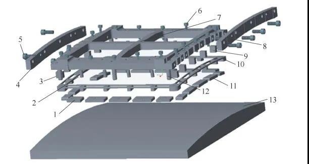 11—左右圓弧夾緊塊(9塊) 12—上下定位銷 13—R1 433mm圓弧墊鐵