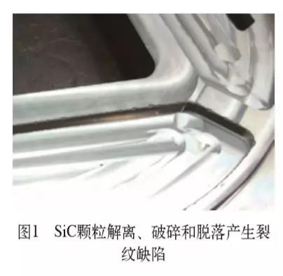 SiC碳化硅/Al合金屬鋁基復(fù)合材料,歸屬于“難加工材料”,實(shí)際上加工時(shí)它形成短切屑,且基體一般為鋁合金,主要是其內(nèi)加入的顆粒增強(qiáng)材料的硬度很高,如SiC碳化硅的硬度高達(dá)3000~ 3500HV。硬質(zhì)顆粒分布在基體中,猶如砂輪中的磨粒一樣會(huì)對(duì)刀具的切削刃起刮磨和沖擊作用,使切削刃很快磨損。硬質(zhì)顆粒硬度愈高,顆粒尺寸愈大,顆粒數(shù)量愈多,則刀具磨損愈快,SiC碳化硅顆粒脫離更明顯,如圖1所示。因此不能將從加工傳統(tǒng)材料中獲得的經(jīng)驗(yàn)和知識(shí)直接應(yīng)用于復(fù)合材料的加工,必須通過(guò)試切削對(duì)其加工性能進(jìn)行研究。