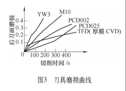 在加工鋁基復(fù)合材料時(shí),既可采用PCD也可使用TFD(CVD 厚膜)金剛石刀具,多種刀具加 工40%SiC碳化硅/Al材料時(shí)的刀具磨損曲線如圖3所示。試驗(yàn)時(shí)采用的切削條件為:車削加工,切削速度 40m/min,進(jìn)給量為0.05mm/r, 切削深度0.5mm,加切削液。