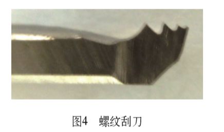 為避免這一現(xiàn)象的發(fā)生,經(jīng)過(guò)多次試切試驗(yàn),改變加工順序:車螺紋底孔→倒角→車螺紋→切退刀槽→倒角,這一方案在加工時(shí),使用成形刀加工出倒角。這樣可有效降低螺紋加工中因切削力和應(yīng)力集中導(dǎo)致的牙頂崩碎現(xiàn)象。螺紋加工完成后,使用自制內(nèi)螺紋牙型刮刀(見圖4)手工去除出入口部位毛刺,并將該部位牙頂?shù)匿忼X刮平修光。最終使加工出的螺紋滿足設(shè)計(jì)要求,內(nèi)外形加工采用同樣加工路徑。